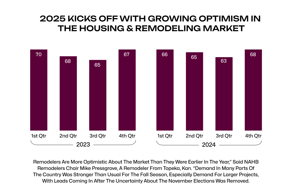 Despite ongoing challenges, the housing and remodeling sectors are showing resilience as 2025 begins. With improving market conditions, stabilizing mortgage rates, and a promising outlook for remodeling and home sales, industry professionals remain cautiously optimistic for the year ahead. Stay tuned!